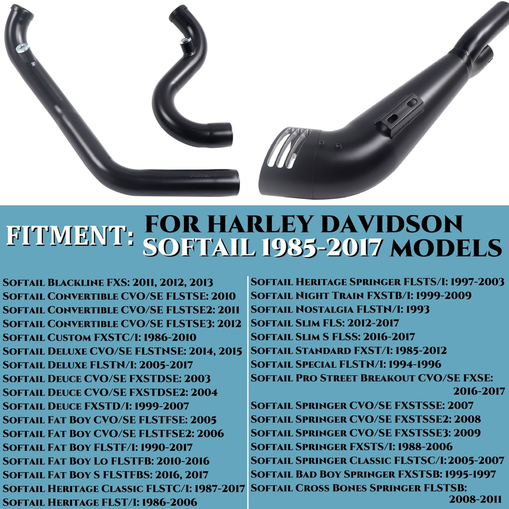 【INDIVIDUAL HEADER PIPES, EASIER TO INSTALL THAN OTHERS.】Easier installation, more enjoyment. Description ---------------- WHY CHOOSE OUR 2 INTO 1 EXHAUST FOR HARLEY SOFTAIL 1985-2017 MODELS? SUCH AS FOR HARLEY DAVIDSON HERITAGE SOFTAIL, FOR FATBOY HARLEY DAVIDSON, FOR SOFTAIL STANDARD EXHAUST, FOR SOFTAIL SLIM EXHAUST, FOR SOFTAIL DELUXE PIPE, ETC.? 1. Performance significant improved. 2. Sound louder and better. 3. Not overpay for a big brand.